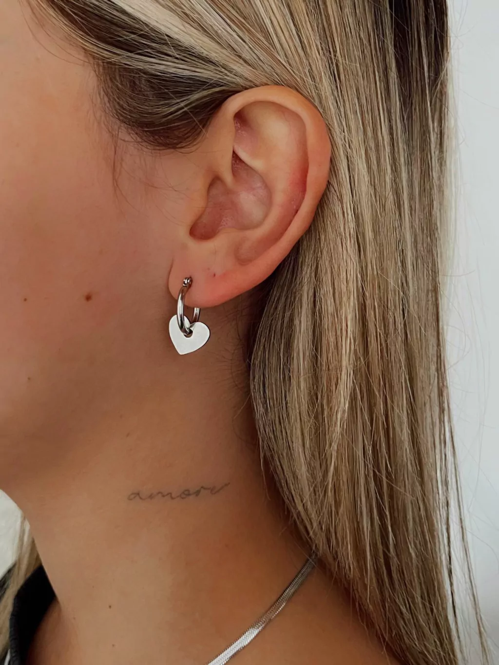 El tamaño de la argollita es de 1,5cm y del dije de corazon calada de 1,2cm. Todo de Acero quirurgico